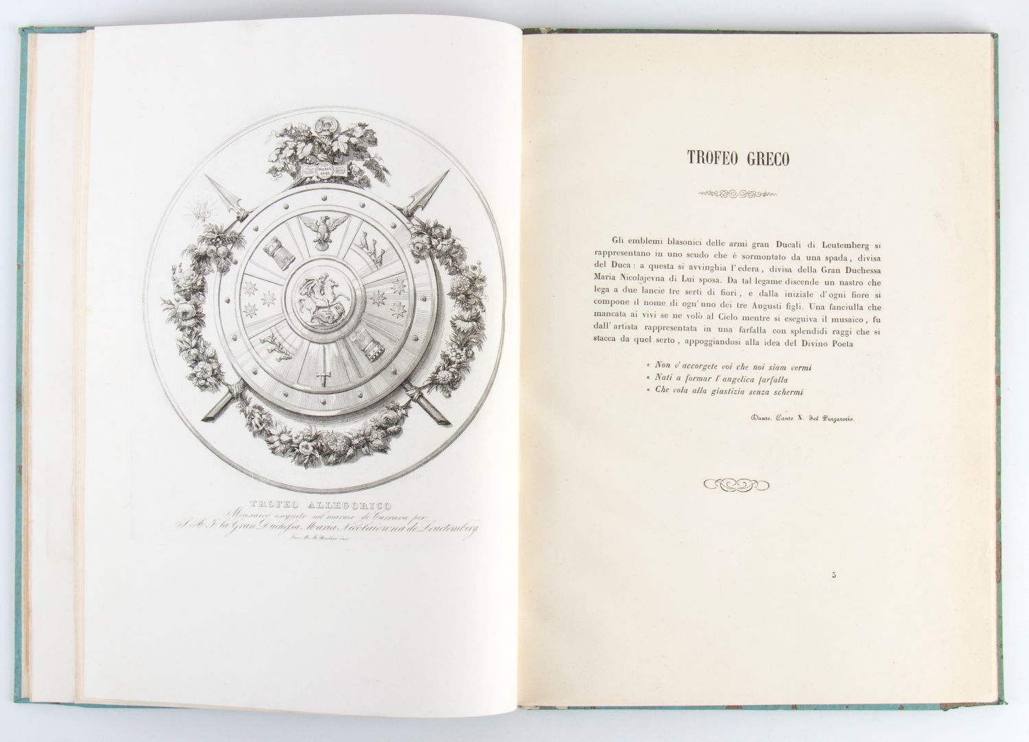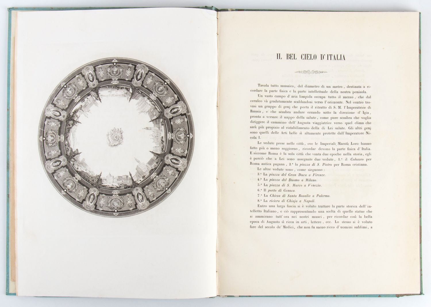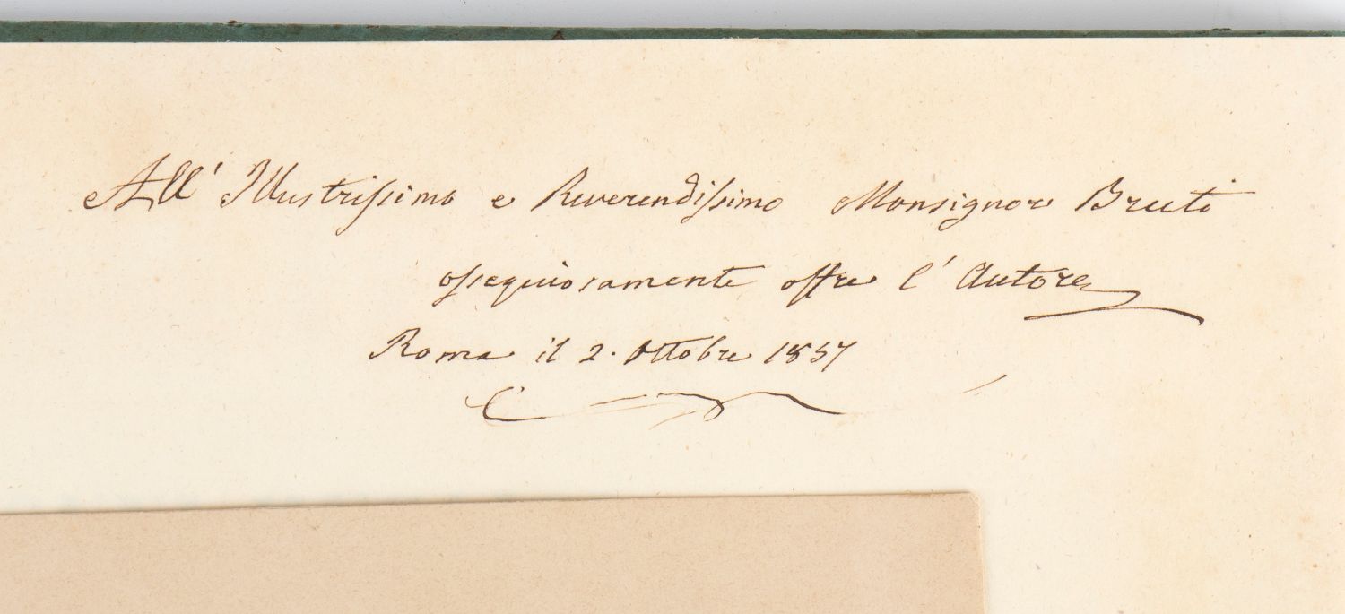 In folio piccolo, foglio di dedicatoria, 11 composizioni f.t in tondo, finissime acquatinte con relativa spiegazione seguite da tavole f.t alcune in delineato.+ appendice con 3 di 4 tavole f.t con relativa spiegazione. Legatura coeva cartonata. Piccole mancanze di carta al dorso. Non comune.Dedica manoscritta dell’autore all’Illustrissimo e Reverendissimo Mons. Bruti ossequiosamente offre l’autore Roma 2 ottobre 1857.