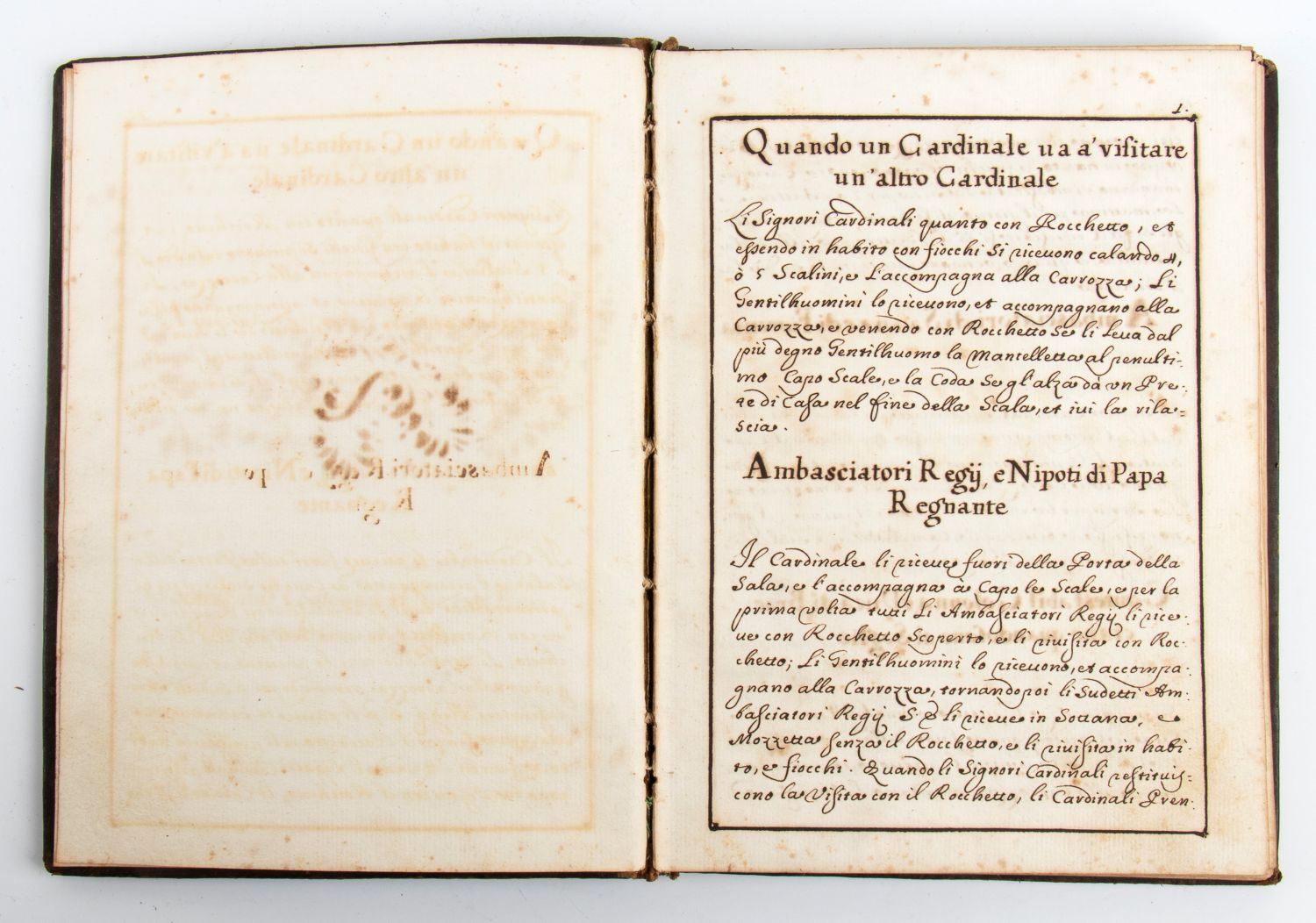 MANOSCRITTO Modo, che sogliono tenere li signori maestri di Camera dell’Emi. E R.mi Signori cardinali per il buon servizio dell’Eminenza loro