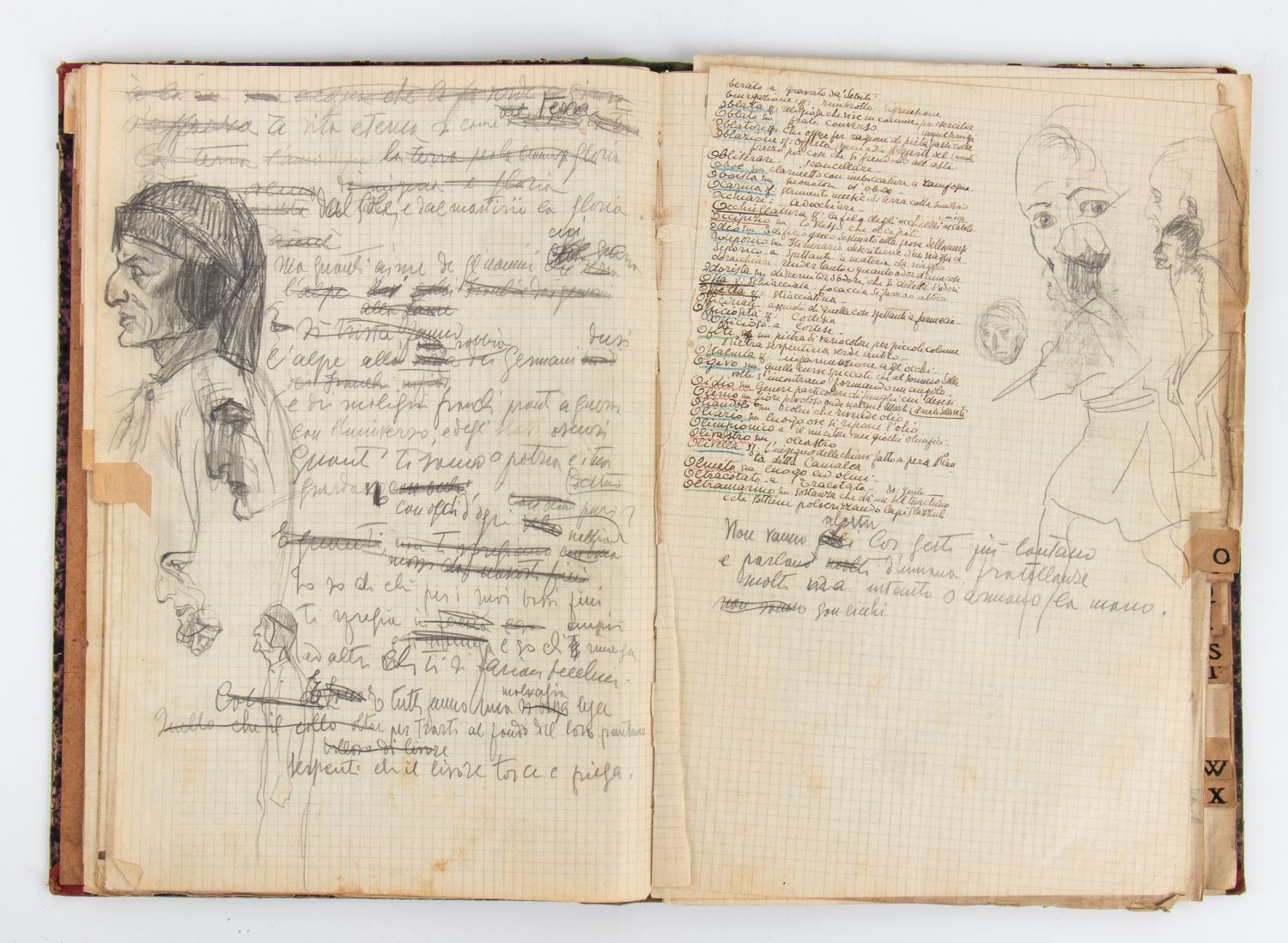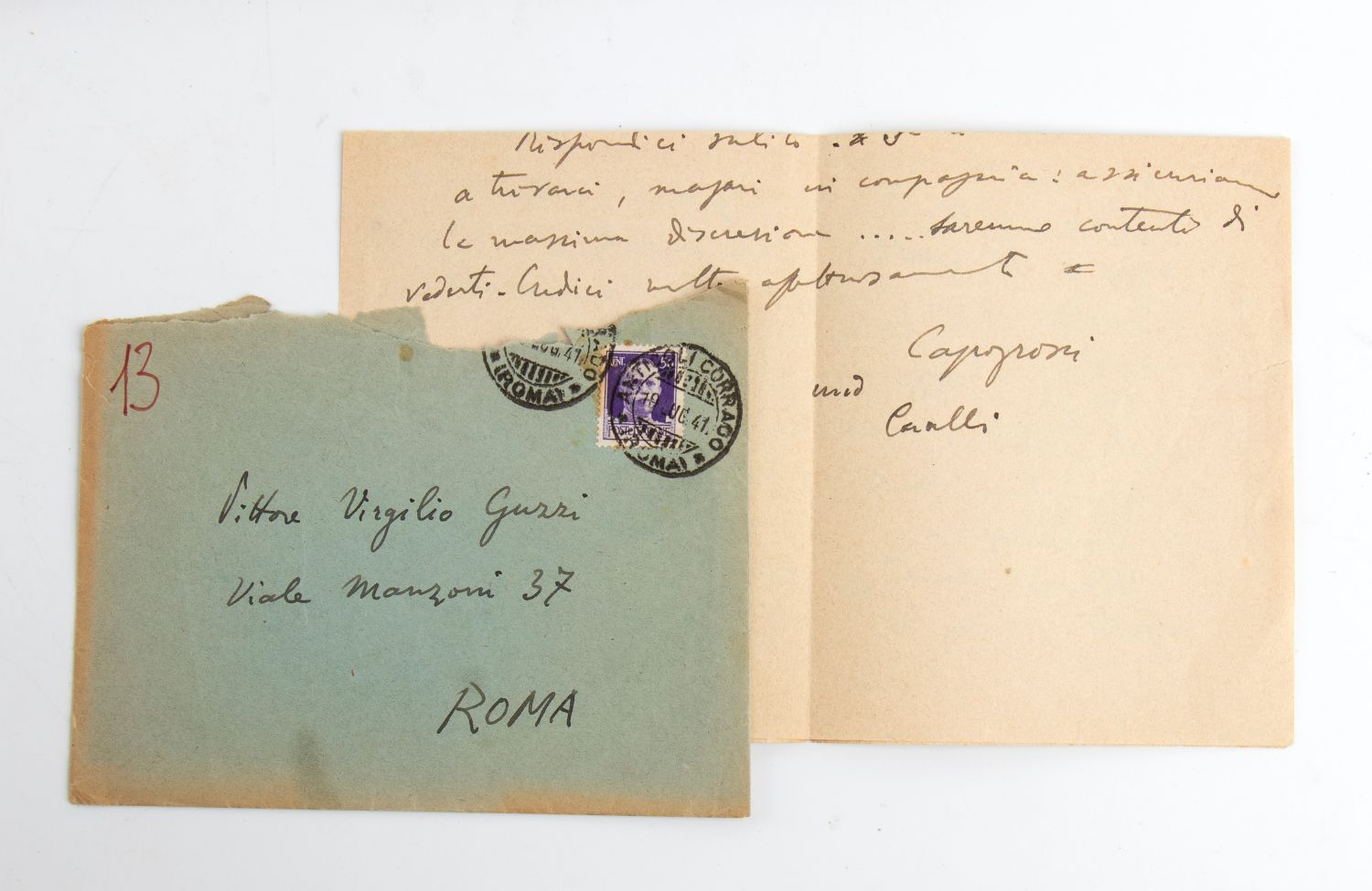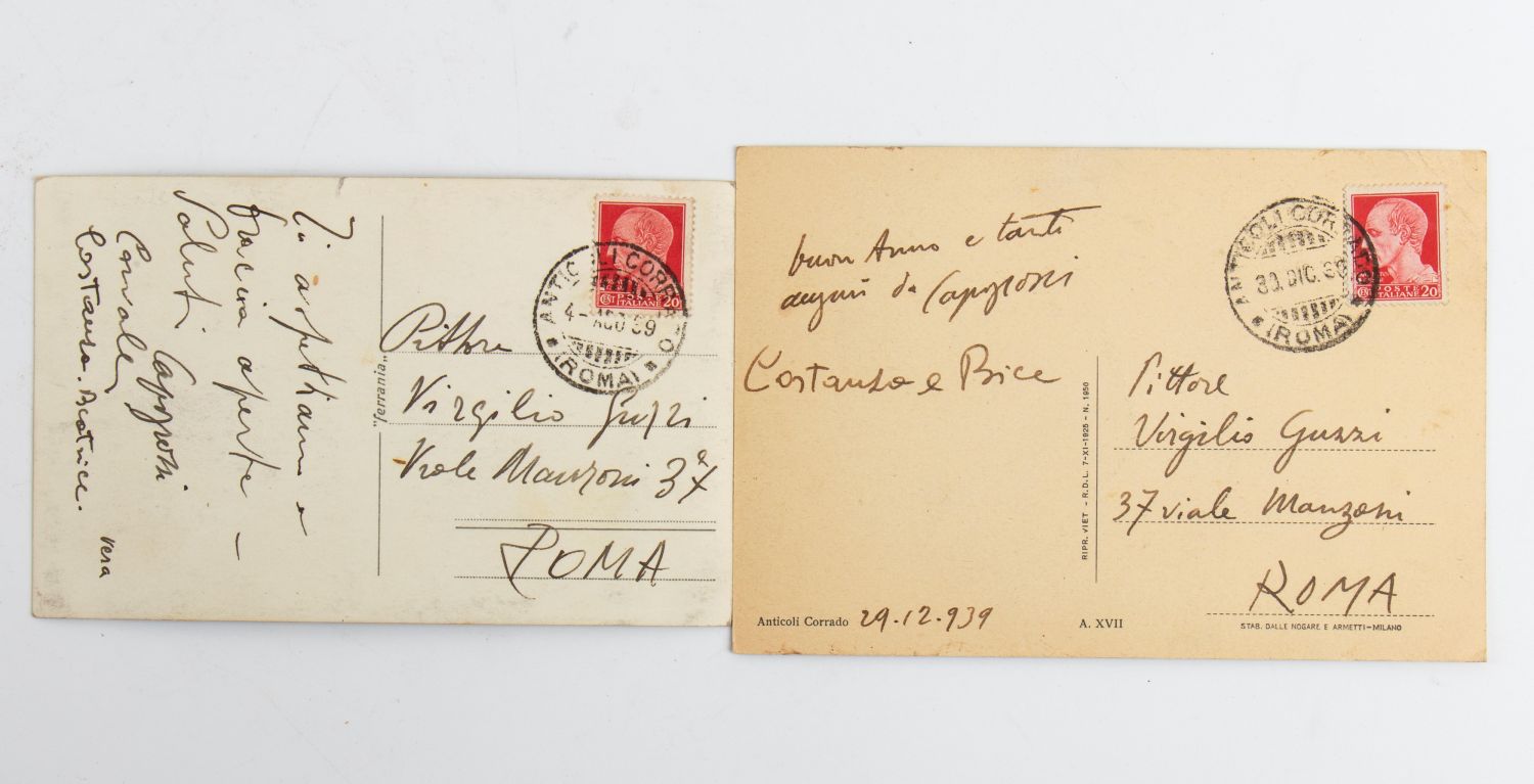 Corrispondenza con lettera di Capogrossi, 2 cartoline indirizzate al pittore romano Virgilio Guzzi e un album personale di schizzi, pensieri e scritte di vario genere, attribuibile a Virgilio Guzzi. Un disegno riporta la firma Virgilio. La lettera, che si compone di due fogli, è scritta da Anticoli Corrado il 16/07/1941. Il pittore si rivolge a Guzzi per organizzare una mostra romana ed è firmata anche dal pittore Cavalli. Insieme molto interessante. Nel lotto anche un dipinto a olio su cartoncino dal titolo Giannetto.