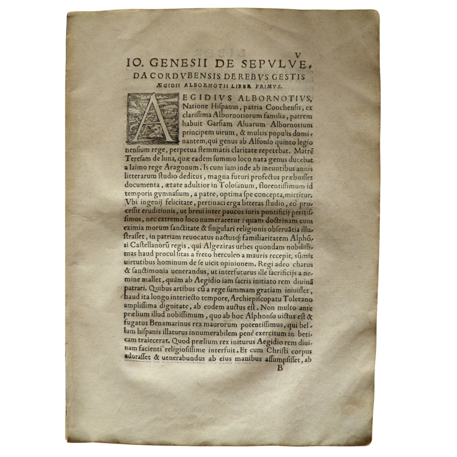 In 4° (295x210); [2], xlvij carte (alcune mal numerate), segnatura A-L4, M6. Armoriale xilografico a mezza pagina al frontespizio, alcuni capilettera xilografici. Brossura del tempo. Gore d’acqua marginali all’ultima pagina, altrimenti ottimo esemplare.Rara prima edizione. Il Domenicano spagnolo Juan Ginés de Sepúlveda studiò teologa e diritto canonico alla Universidad de Alcalá e in seguito al Collegio di San Clemente a Bologna, dove fu allievo di Pietro Pomponazzi (un Averroista e massimo esperto di Aristotele) e si adottorò in arti e teologia. Fu in seguito il cronista reale ufficiale di Carlo V e precettore di Philip II. Tra il 1550 e il 1551 fu, insieme a Bartolomé de Las Casas, uno dei protagonisti della famosa disputa di Valladolid riguardante la leggittimità della conquista delle Americhe.