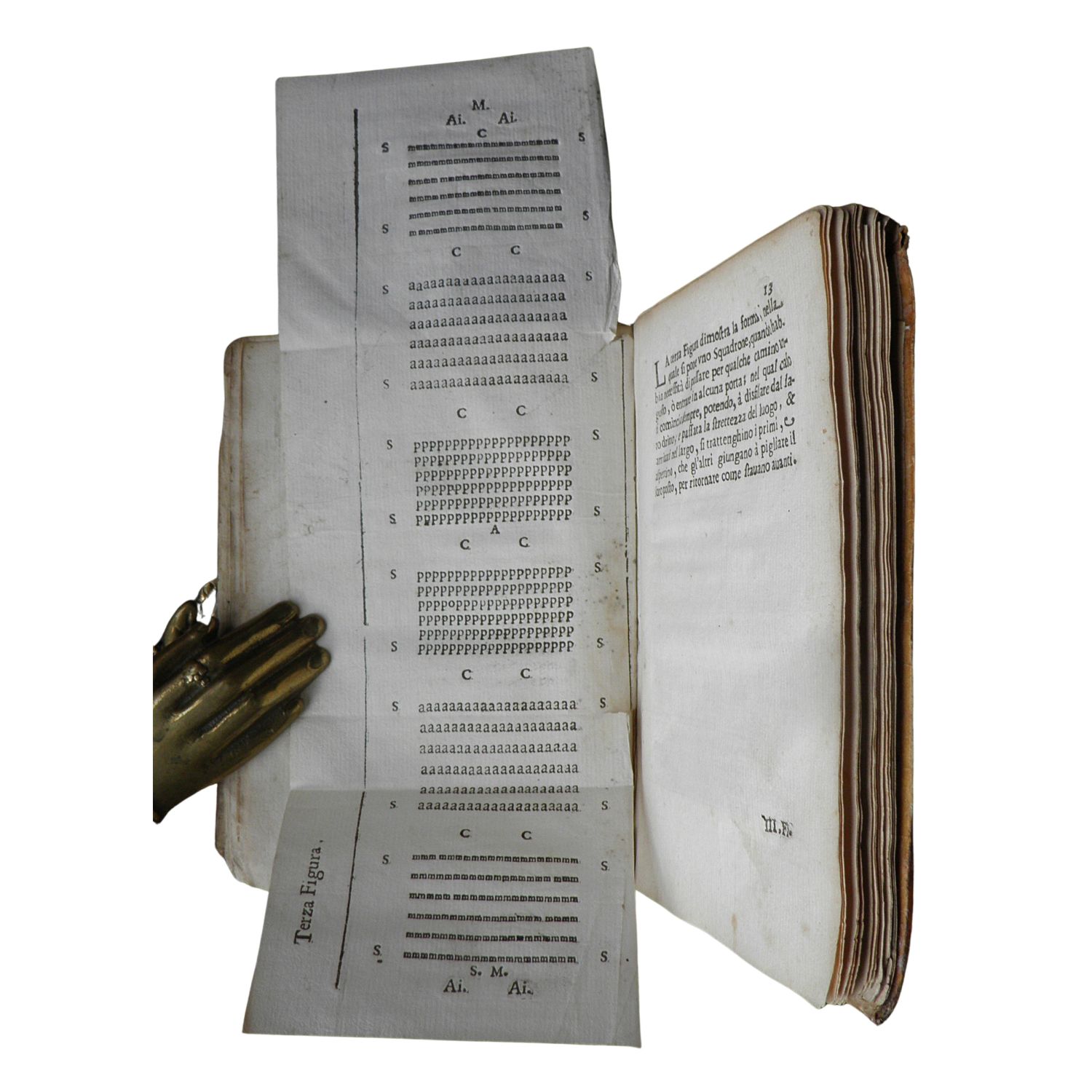 In 8°; [24], 43, [1] pagine, [4] tavole ripiegate (in forma di strisce, rappresentanti le formazioni delle truppe). Segnatura a-c4, A-E4, F2 (carta a1 bianca). Ritratto inciso del traduttore - Obizzo Annibale Marescalchi, membro della nobiltà militare bologneseof the Bolognese military nobility - e dell’autore alle carte b3v e b4r, rispettivamente. Pergamena floscia originale.Traduzione in italiano, poco comune, di questo curiose compendio sull’arte della guerra, originariamente pubblicato, nello stesso anno, sotto il titolo di Pensamientos militares. Dedicato a temi sia di tattica che di strategia, questo trattatello si concentra sulla soluzione di situazioni di svantaggio, con particolare attenzione alle tecniche da impiegare durante battaglie che si svolgono in condizioni di inferiorità numerica e alle tattiche necessarie a rompere un assedio. Molto poco si sa dell'autore. Nato a Palermo, nel 1618 vi ricoprì la carica di senatore, intraprendendo poi una rapida carriera militare, interrotta da una congiura politica (di cui sarebbe stato vittima) che lo fece cadere in disgrazia e lo costrinse a rifugiarsi in Francia, dove tuttavia fu nominato feldmaresciallo da Luigi XIV (1638-1715). Anni dopo in seguito a un viaggio in Perù le cui ragioni sono sconosciute, fu in Portogallo, con il titolo di Praefectus Castrorum. Nel 1670 era ancora in attesa del perdono reale. Allo scoppio della rivolta di Messina contro il governo spagnolo (1674-8), venne chiamato come consigliere militare da Fernando Joaquín Fajardo de Requeséns y Zúñiga (1635 - 1693), viceré di Napoli dal 1675 al 1683. Sarebbe stata la perfetta occasione per riconquistare il favore della famiglia reale, ma Opizinghi morì improvvisamente prima della fine delle ostilità.