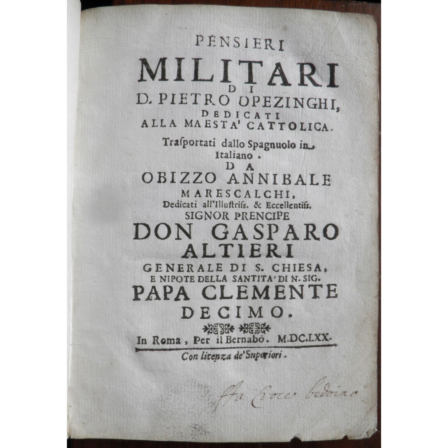 Pietro degli OPIZINGHI TAGLIAVIA. Pensieri militari di D. Pietro Opezinghi, dedicati alla Maestà Cattolica, Roma, per il Bernabò, 1670