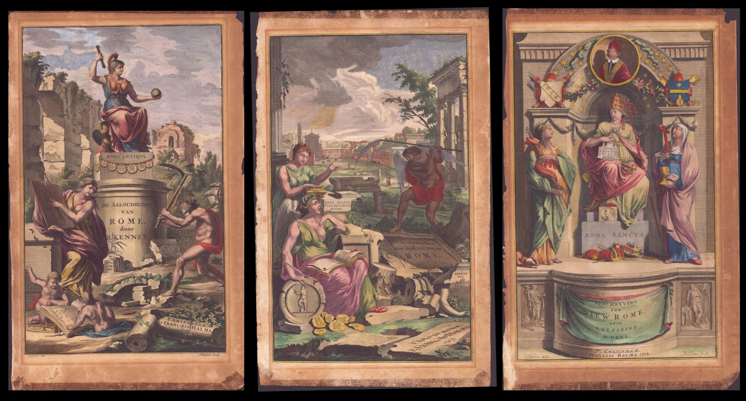 Bulino e acquaforte, 390 x 240 mm (cad. foglio). Stampate su carta vergata. Fogli con bruniture sui margini e residui di colla. Alcune mancanze lungo i bordi. Nel complesso in buono stato.