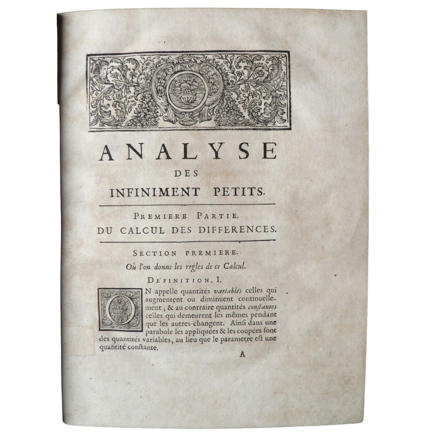 In 4°; XVI, 182 pagine, 11 tavole incise ripiegate; testatine xilografiche. Annotazioni marginali di mano antica alle prime venti pagine; margini destro e inferiore delle pagine 5/6 e 7/8 tagliati e sostituiti (forse per modificare annotazioni preesistenti), con annotazioni della stessa mano. Pelle d’epoca. Leggere brubiture. Esemplare molto buono.La prima edizione comparve anonima nel 1696; prima opera del nobile francese e matematico Guillaume François Antoine de L’Hopital. Viene qui descritto per la prima volta il teorema noto come Regola di de l'Hôpital (o regola di Bernouilli). Nella prefazione l’autore riconosce di essere indebitato a Bernouille, del quale era stato studente, e a Leibniz. Dopo la morte di de l'Hôpital, Bernouilli reclamò la paternità del teorema.
