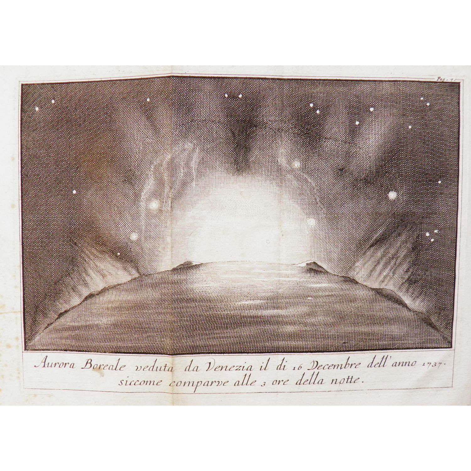 In 4° (170x230); 119, [1] pagine. Signatura; A1-8, B-P1-4. Piccola xilografia al frontespizio, una grande tavola incisa ripiegata, 2 tavole incise, 1 tabella. Pergamena dell’epoca. Dorso restaurato. Macchie a entrambi I piatti, macchie larghe ma pallide ai fogli di guardiae ai risguardi. Interno molto buono.Edizione unica. Sguario era un medico, con l’hobby dello studio della fisica ed è in genere considerato il primo autore italiano a scrivere testi riguardanti l’elettricità. Quest’opera, la prima da lui scritta, fu occasionata dll’aurora boreale osservata in Venezia negli ultimi giorni del 1737, un raro fenomeno a tale latitudine. Negando la possibile correlazione del fenomeno con un tipo di combutione, Sguario lo considera dovuto alla rifrazione dei raggi solari dovuta a corpuscoli presenti nell’atmosfera. Quest’opera fu seguita da una sull’applicazione dell’elettricità alla medicina, una sui terremoti e numerose altre di soggetto puramente medico.