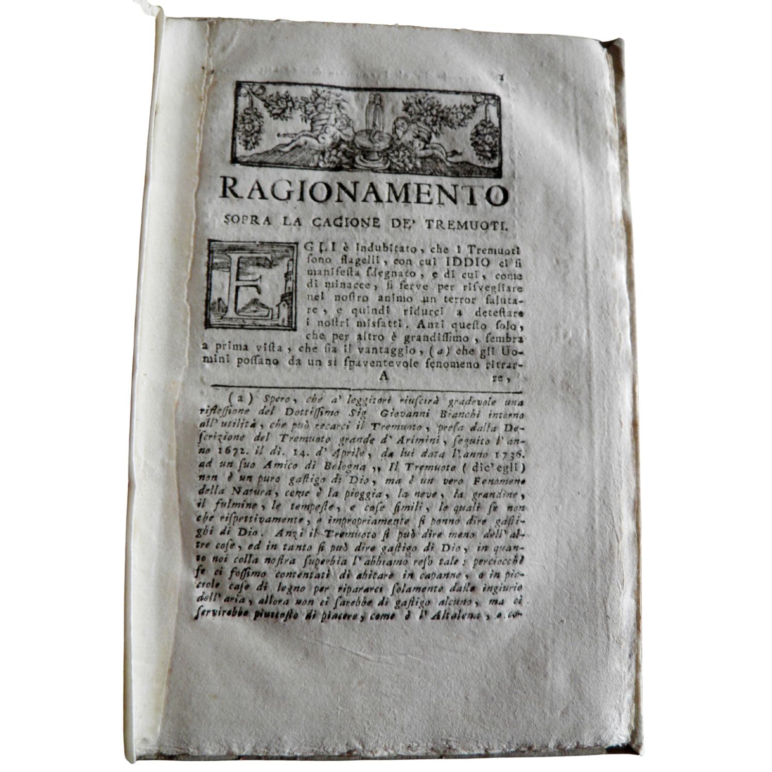 Andrea BINA. Ragionamento sopra la cagione de’ tremuoti del P. Don Andrea Bina Casinese... , Carpi, Francesco Torri, 1756