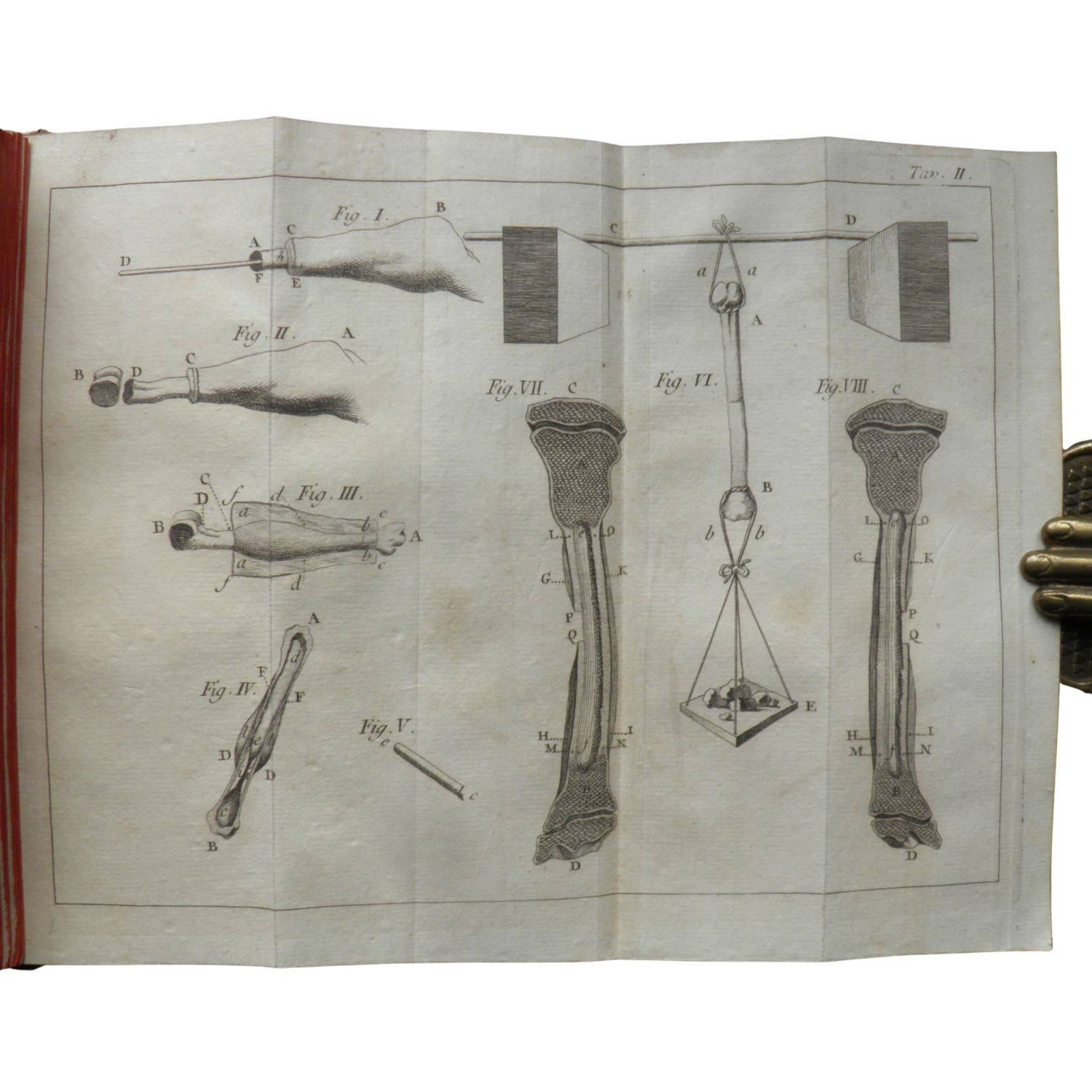 In 8° grande (200x175); XIX, [1], 288 pagine. Segnature a10, A-S8. VIII tavole incise ripiegate, 1 tabella ripiegata. Pergamena d’epoca, arabeschi incisi a secco a entrambi i piatti, titolo al dorso. Tavole leggermente brunite, ma esemplare ottimo. Prima edizione italiana, precedentemente pubblicato in latino nel 1775. Michele Troja è famoso per I suoi lavori sulla formazione del callo osseo e e sulla nutrizione e rigenerazione delle ossa. Dopo un periodo a Parigi, tornò a Napoli dove ottenne la cattedra di oftalmologia; pubblicò una collezione delle lezioni da lui tenute e scrisse anche un importante lavoro di urologia. Fu inoltre l’inventore del catetere flessibile.