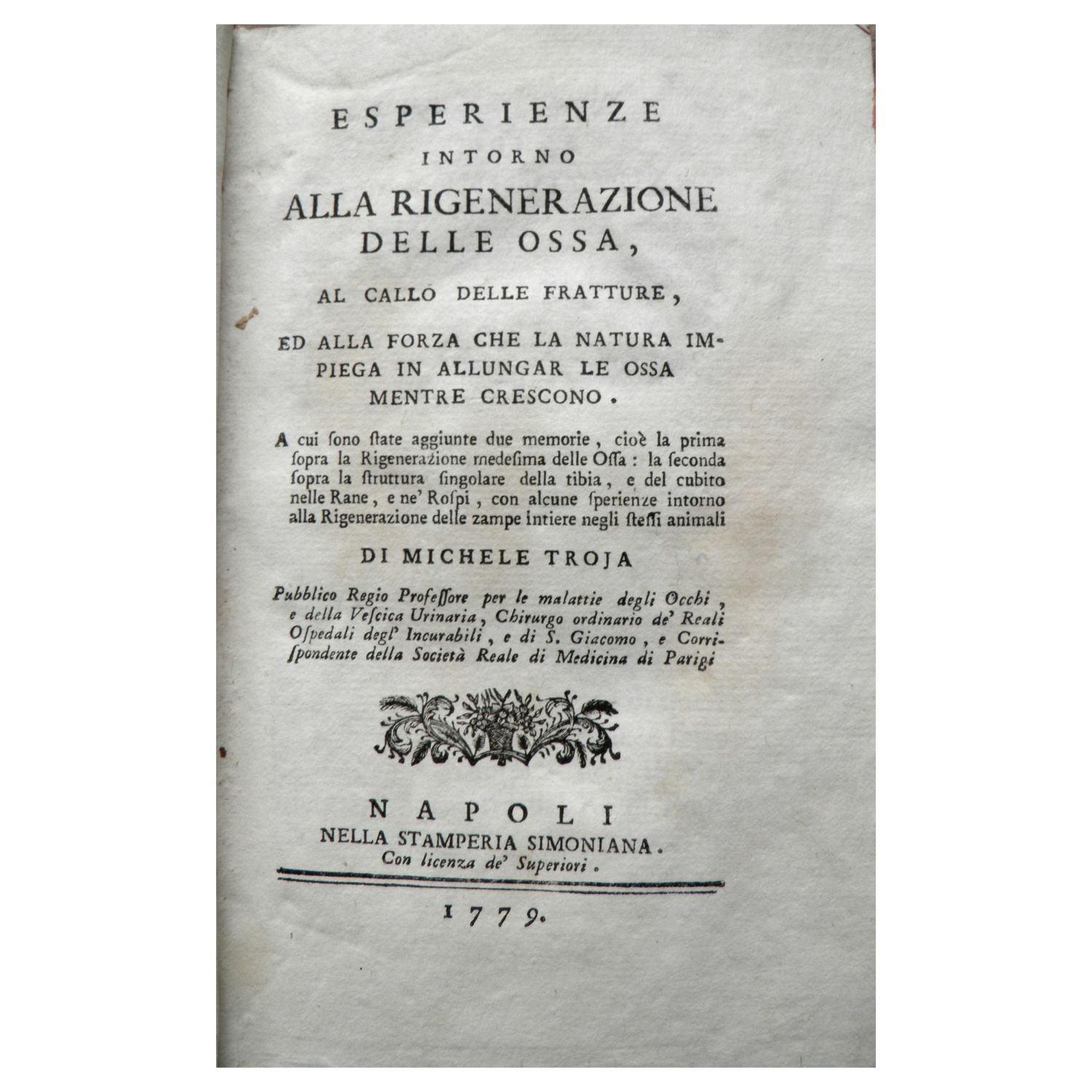 TROJA, MICHELE. Esperienze intorno alla rigenerazione delle ossa, al callo delle fratture, ed alla forza che la natura impiega in allungar le ossa mentre crescono..., Napoli, nella stamperia Simoniana, 1779