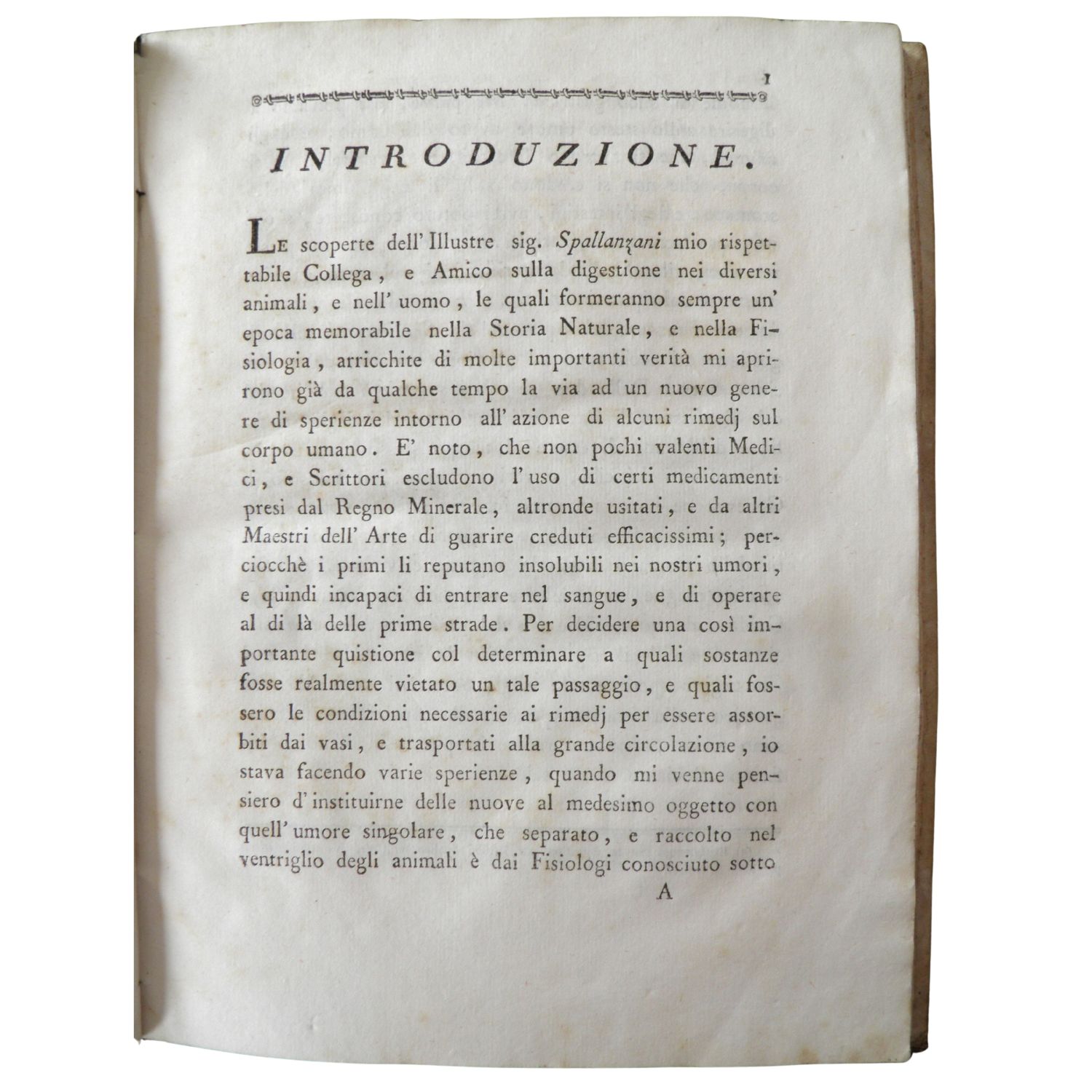 In 4° (205x260); [IV] carte, 130 pagine. Segnatura: []4, A-P4, Q6. Pergamena d’epoca, con aggiunta posteriore di carta marmorizzata al dorso e parte dei piatti; etichetta con titolo in oro al dorso. Ottimo esemplare.Prima edizione, tradotta in tedesco lo stesso anno. Carminati studiò a Pavia e per alcuni anni praticò la medicina a Lodi, sua città natale; qui pubblicò il suo primo lavoro nel 1777, il successo del quale gli procurò la cattedra di terapia, medicina e farmacologia all’Università di Pavia. In seguito fu eletto membro dell’Istituto Italiano di Scienze, Lettere ed Arti (Hoefer; De Renzi). Carminati studiò I succhi gastrici in animali nutriti e a digiuno e ne suggerì l’uso nel trattamento di alcuni tipi di cancro, ulcere e ferite.