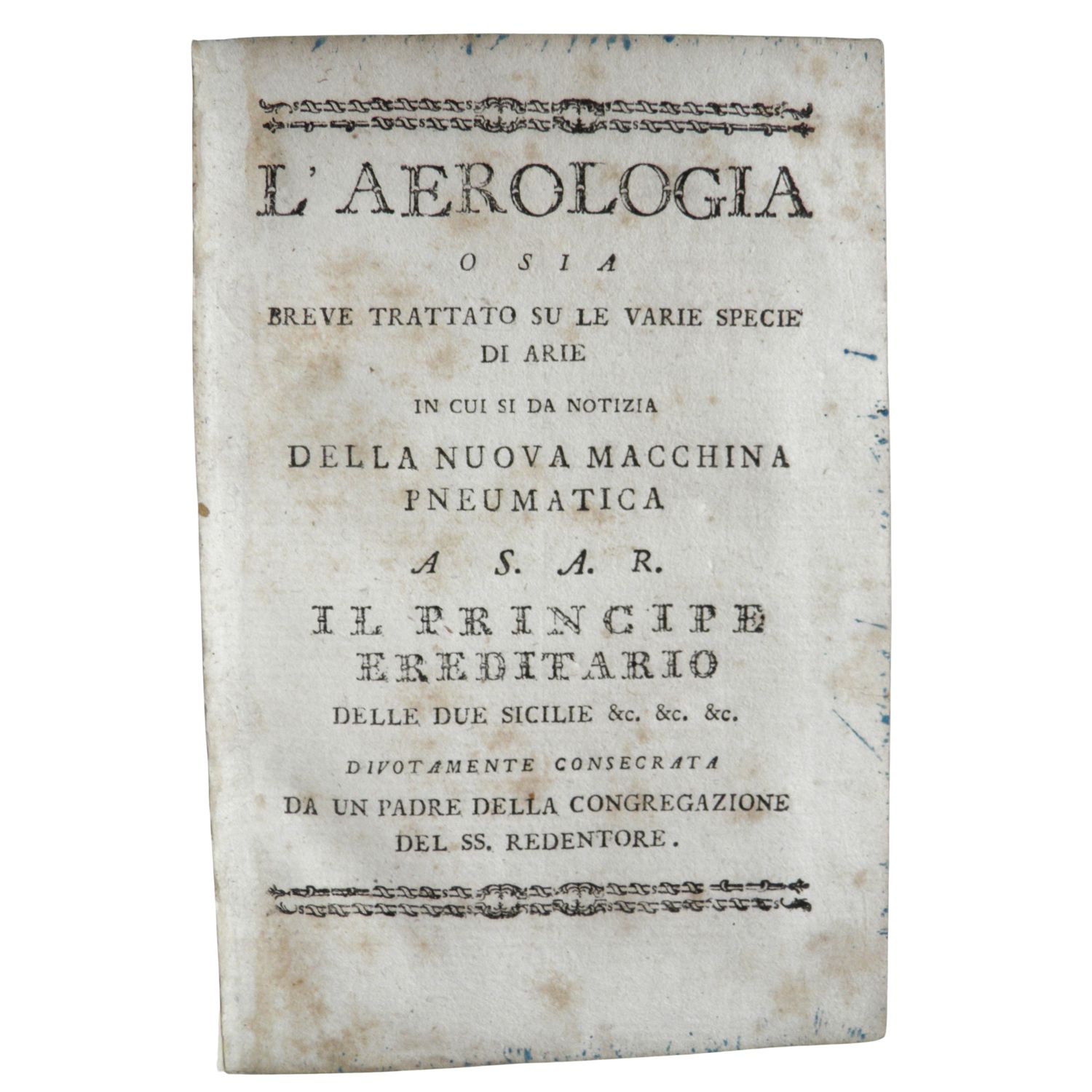 2 parti in 1 volume, in 8° (180x115.); XII, 112 pagine; 79, [1] pagine. Segnatura []6, A-E8. 1 tavola incisa ripiegata. Cartonato d’epoca, eticatta con titolo in oro al dorso. Insignificanti bruniture sparse. Esemplare molto buono.Prima edizione, estremamente rara. Il primo lavoro avrebbe dovuto essere pubblicato a Napoli l’anno precedente (l’imprimatur è datato 30 gennaio 1794), ma venne ritardato dall’improvviso spostamento dello stampatore da Napoli a Salerno. Quando finalmente pronto per la stampa, un non meglio identificato Maestro consiglio l’autore di aspettare il completamente della seconda parte, allo scopo di pubblicare un lavoro completo ed esauriente. Pandullo fu d’accordo e il lavoro venne pubblicato nel 1795 nella forma presente, con l’inclusione dell’appendice in cui viene descritto il ventilatore. L’autore descrive diversi tipi di aria, la loro composizione e le loro proprietà e discute i lavori di autori precedenti aull’argomento.Nulla si sa dell’autore oltre quanto riportato nel frontespizio, che era un padre Redentorista, membrodella Congregazione del SS. Redentore, fondata da S. Alfonso Maria de’ Liguori.
