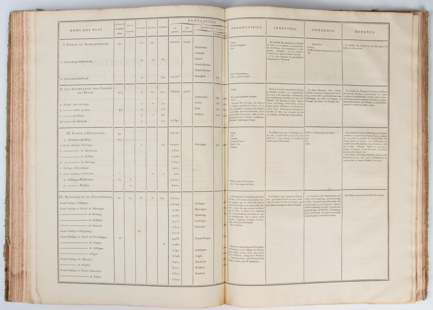 In folio, pp. IV+31 tavole di cui una doppia di tavole statistiche. Cartonato editoriale coevo.Traduzione francese di Griffet de la Beaume pubblicata da Adrien Cyprien Duquesnoy, de la Statistiche Uebersicht der deutschen Staaten. L’autore pubblica alla fine del XVIII secolo una serie di opere di economia ricche di statistiche. Il testo proposto risulta molto ricco di informazioni sui diversi stati dell’Impero Germanico in età Napoleonica.Basel, 1800. Kress B 4198. Goldsmith 18135.