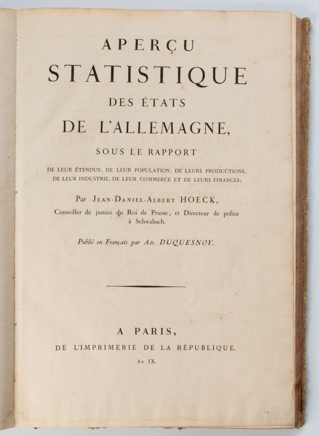 Jean Daniel Hoeck. Aperçu statistique des Etats de l’Allemagne, sous le rapport de leur étendue, de leur popolation, de leurs productions, de leur industrie, de leur commerce et de leurs finances, Paris, Imprimerie de la repubblique, an IX (1801)