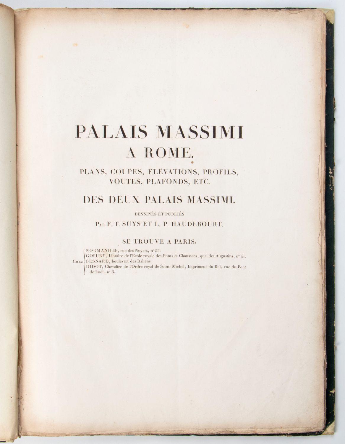 SUYS, F. T. & HAUDEBOURT, L. P. Palais Massimi à Rome. Plans, coupes, élévations, profils, voûtes, plafonds, etc. des deux palais Massimi. Dessinés et publiés par F. T. Suys et L. P. Haudebourt, Paris, Normand fils, (1818)