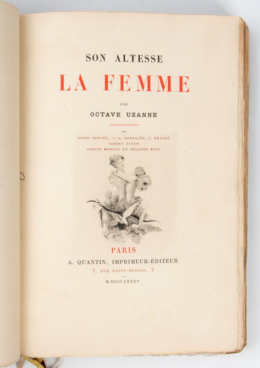 In 8° grande, pp. XII+314. Brossura originale figurata. Con tavole incise a colori di Gervex, Lynch, Kratké, Moreau, Gonzalès, di cui tre particolarmente ricercate di Félicien Rops, numerose illustrazioni nel testo, brossura editoriale illustrata a colori conservata entro legatura coeva in pergamena rigida, autore.