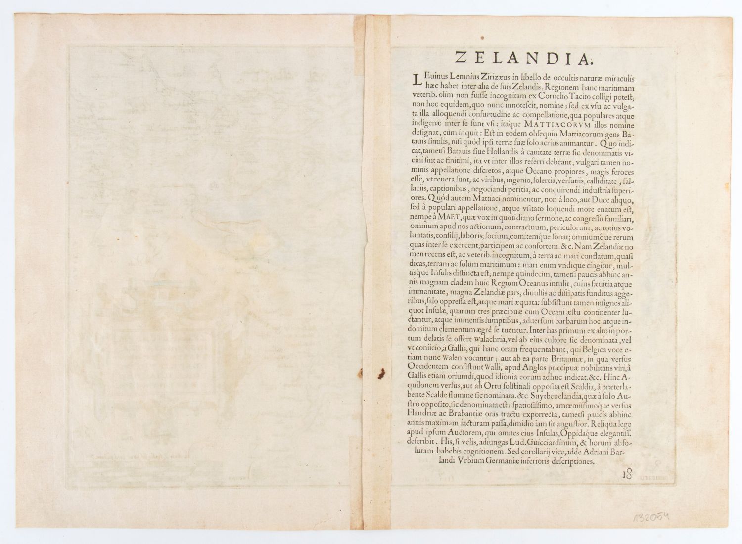 Acquaforte e bulino, 391 x 548 mm (foglio). Mappa di Zelanda, provincia di Paessi Bassi, tratta da "Theatrum Orbis Terrarum". Bella impressione su carta vergata con filigrana. Colorata a mano. Al verso testo in latino. Consueta piega editoriale, margini preservati. In ottimo stato di conservazione salvo leggere bruniture.