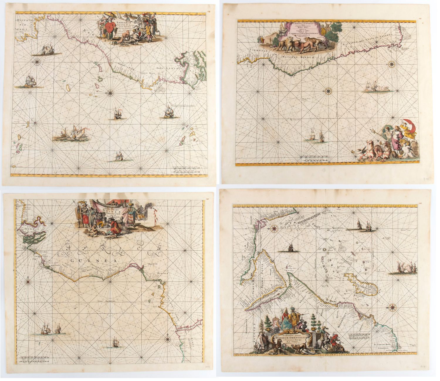 Lotto di quattro mappe nautiche della costa africana. Acquaforte e bulino, 535 x 615 mm ca. (cad. foglio).Belle impressioni su carta vergata, colorate a mano. Tracce, poco visibili, di consuete pieghe editoriali, grano margini preservati. In ottimo stato di conservazione generale salvo leggere macchie sui margini.
