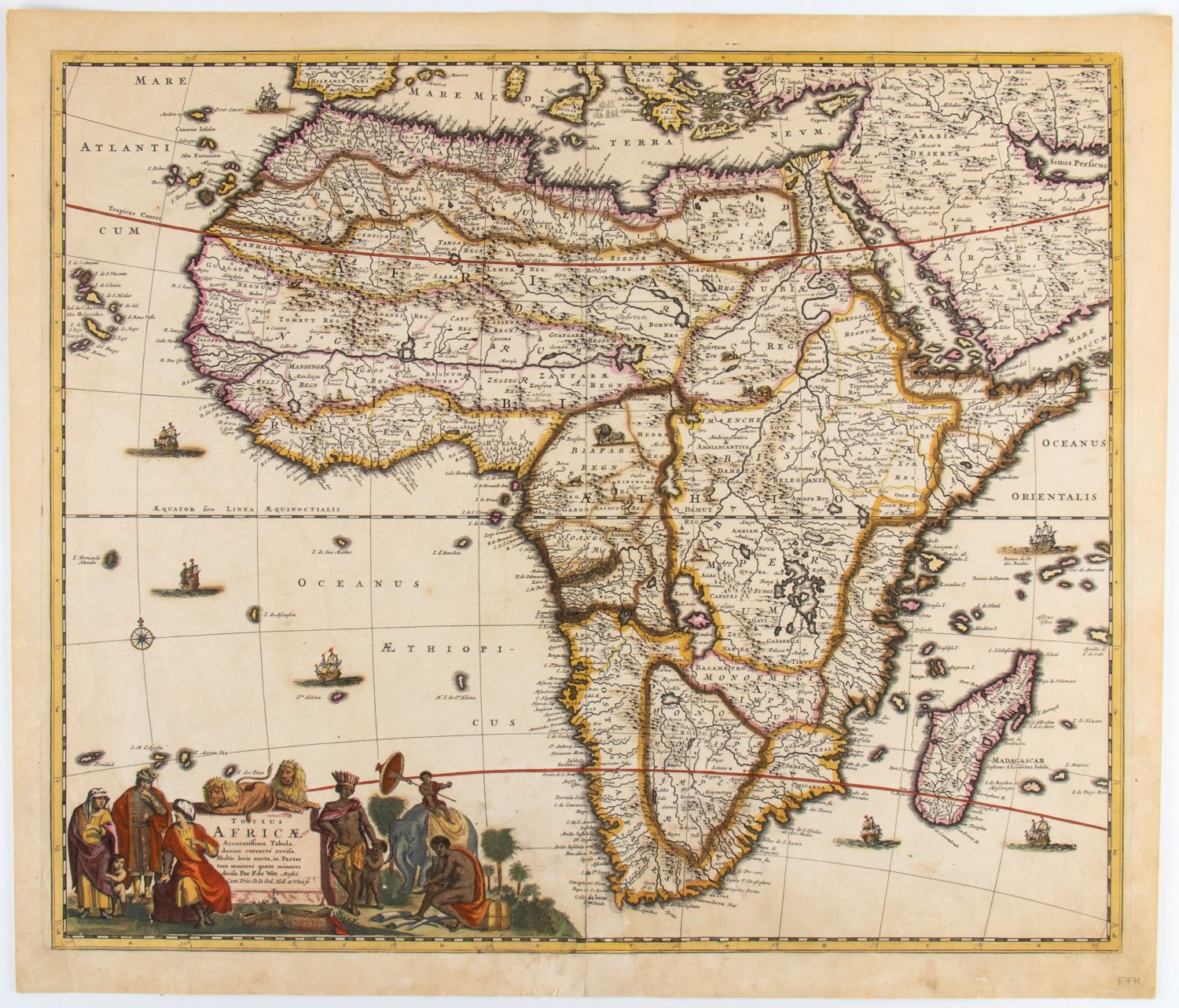 Acquaforte e bulino, 535 x 620 mm (foglio).Mappa dell'Africa. Bella impressione su carta vergata, colorata a mano. Consueta piega editoriale, rinforzata al verso. Margini preservati. In ottimo stato di conservazione salvo brevi strappi sui margini, restaurati.