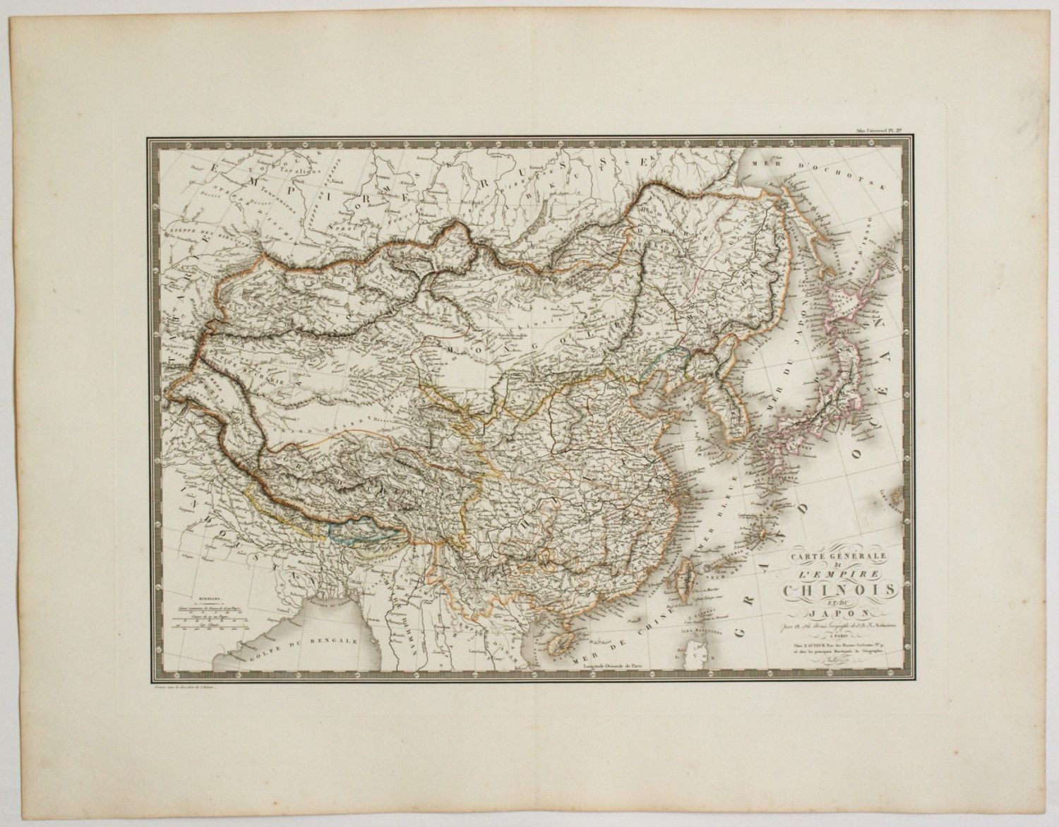 Acquaforte e bulino, 535 x 690 mm (foglio). Prima edizione. Tratta da "Atlas universel". Sopra il cartiglio timbro a secco del autore "CARTE ENCYPROTIPE | DU FONDS | DE L’AUTEUR e iniziali AB" (Lugt 5271).Molto bella impressione stampata su carta non vergata. Foglio con grandi margini preservati. In ottimo stato di conservazione.