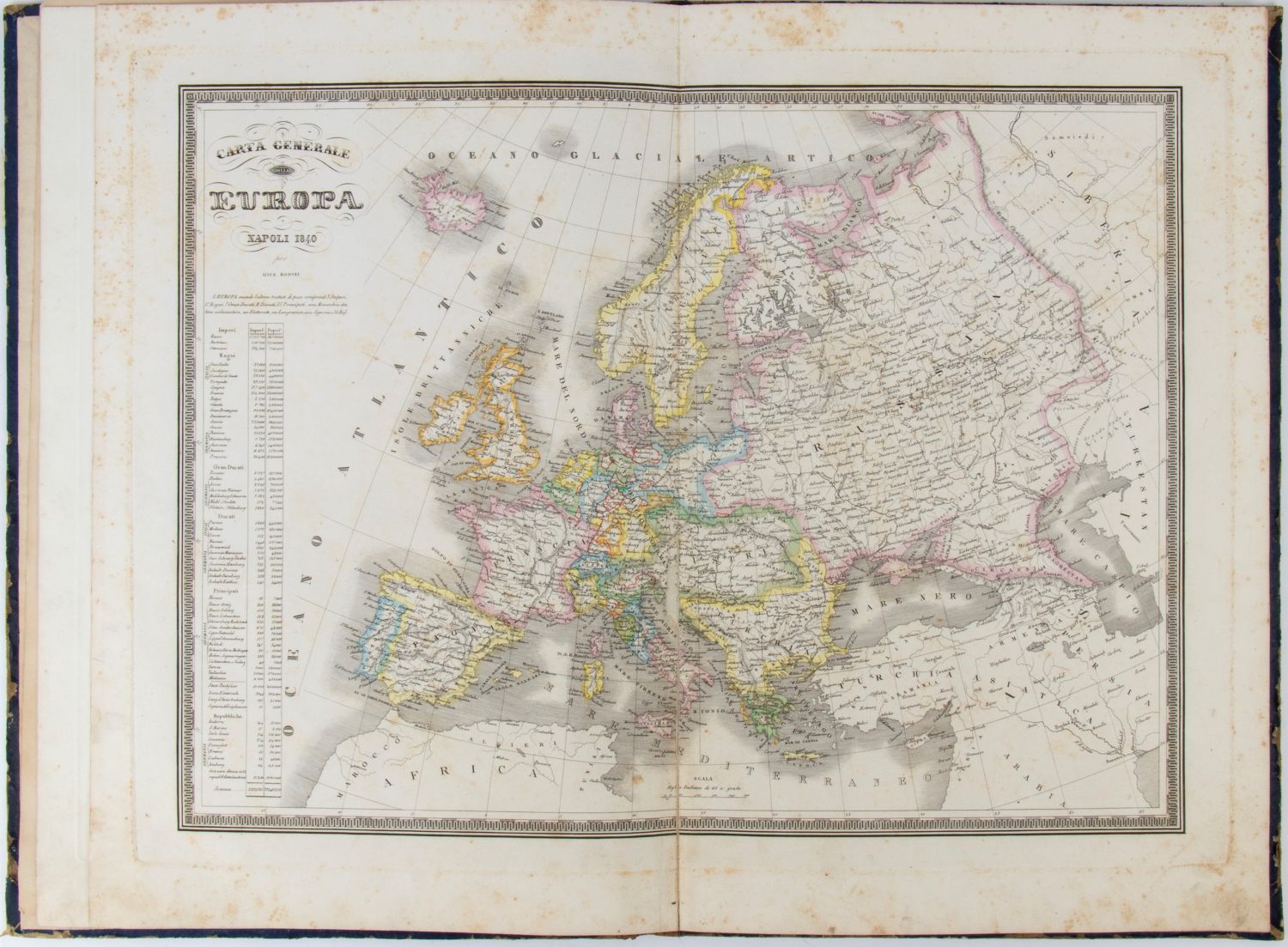 In-folio. Legatura in mezza pelle con difetti. Carte in ottimo stato, salvo segni di sporco e alcune fioriture. Raro.Collezione di otto carte geografiche in doppio folio. La prima, "Sferoide Terrestre in Prospettiva", con dedica a D. Niccola Santangelo, firmata e datata in lastra. Rispetto alle due copie dell'atlante descritte da Valerio, è presente in aggiunta la "Carta Generale Oceania". Rif. Vladimiro Valerio, Atlantes Italici. The Creation of an Italian Atlas Virtual Library, 2022, Liber Amicorum, pp. 262-270 (Rod 1A).