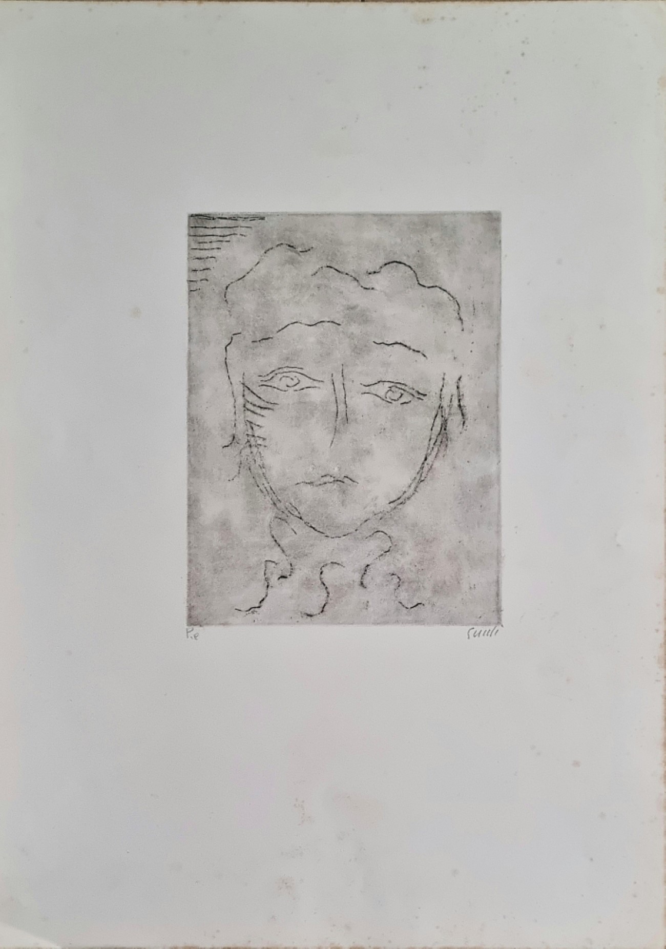 GUIDI VIRGILIO Roma 1891 - Venezia 1984 "Senza titolo" Incisione serigrafica su cartoncino cm 50x70 (foglio), cm 22,5x31 (disegno). Firmata sul fronte in basso a destra, tiratura P.A. a sinistra. (Presenta fioriture).