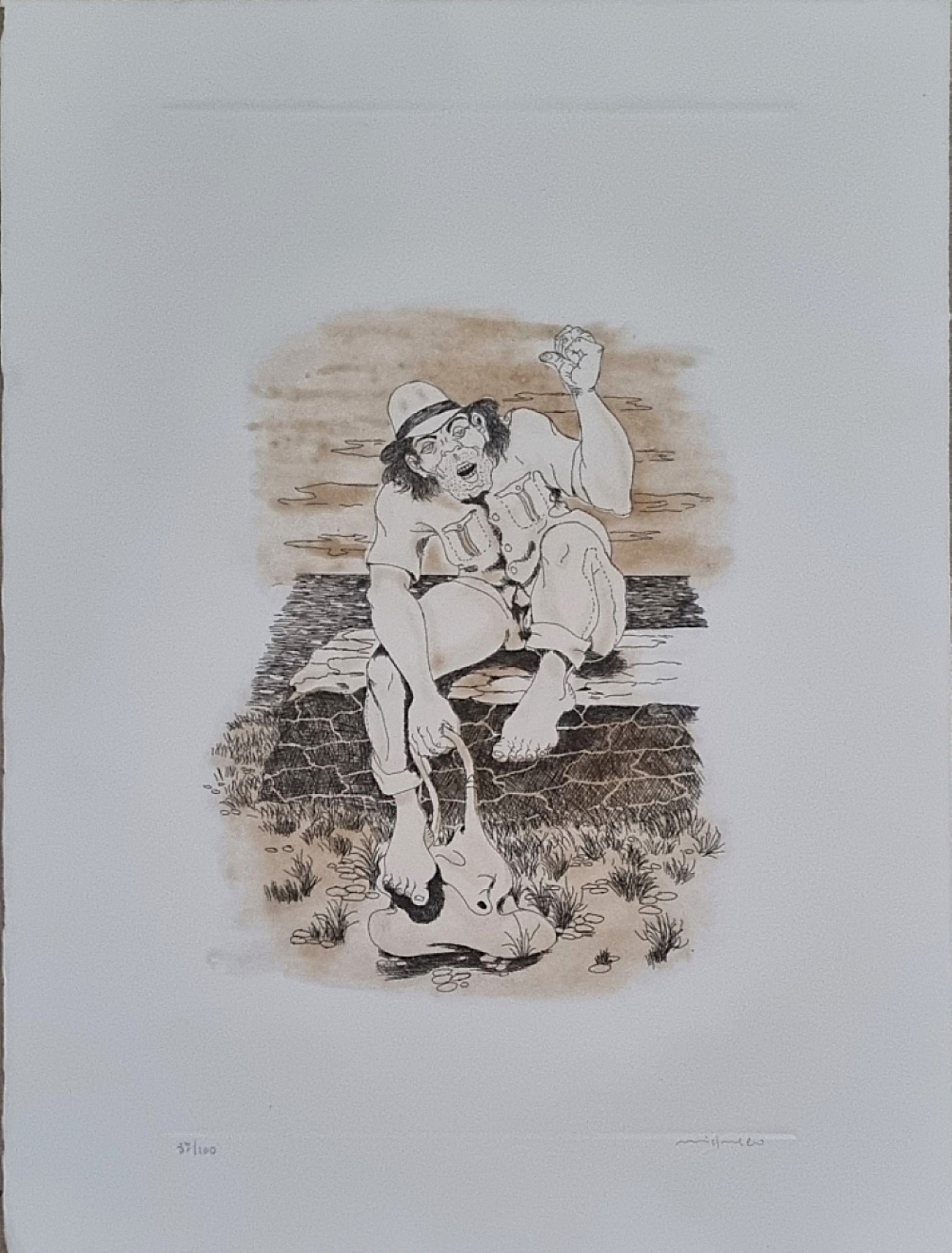 MIGNECO GIUSEPPE Messina 1903 - Milano 1997 "Autostop" Acquaforte su cartoncino cm 45,5x61 del 1976. Firmata sul fronte in basso a destra, tiratura 37/100 a sinistra. Al verso timbro di garanzia a cura di Raffaele Bandini Editore.