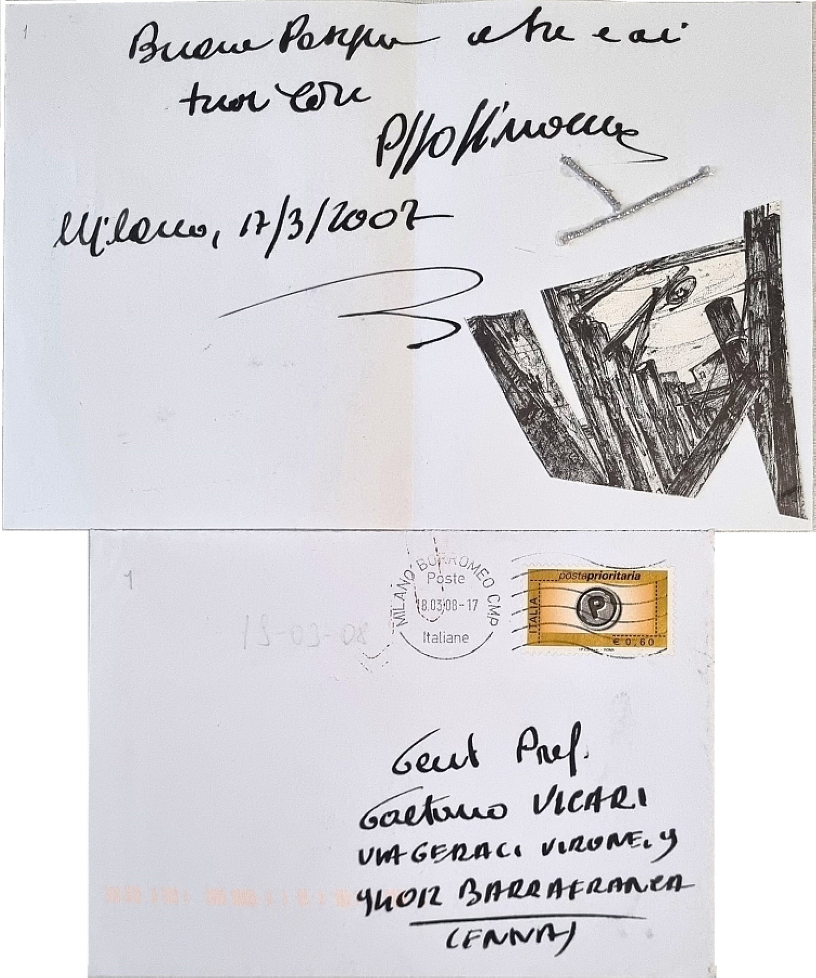 SPINOCCIA PIPPO Siracusa 1928 "Senza titolo" Collage su lettera cm 21x14 del 2007. Firmata e datata al centro. Corredata da busta per lettera originale.