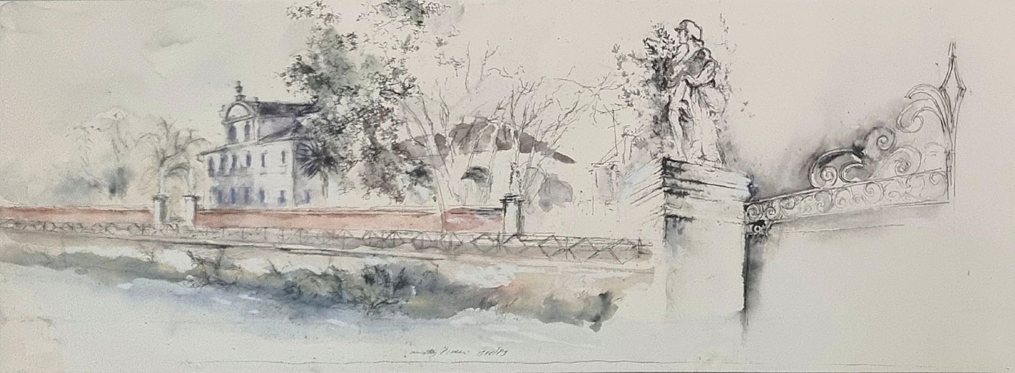 PIACESI WALTER Ascoli Piceno 1929 - Fermignano 2022 "Villa Sheriman - Widmann - Foscari" Inchiostro su carta cm 73x27 del 1988/89. Firmata e datata sul fronte in basso a destra. Sul retro data, titolo, tecnica e misure.