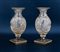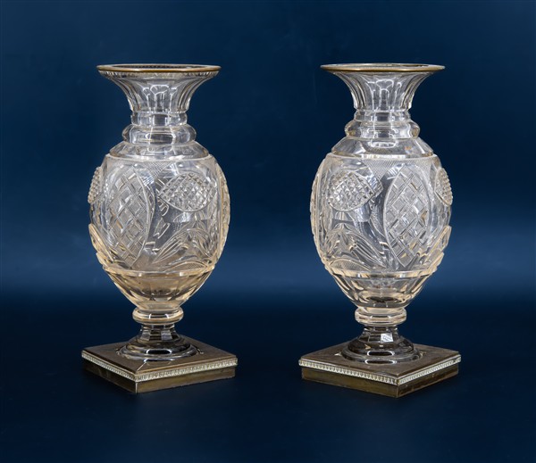 Coppia di vasi a balaustro in vetro molato a motivi geometrico con collo e base in bronzo. Inizio secolo XX (h cm 26) (difetti)