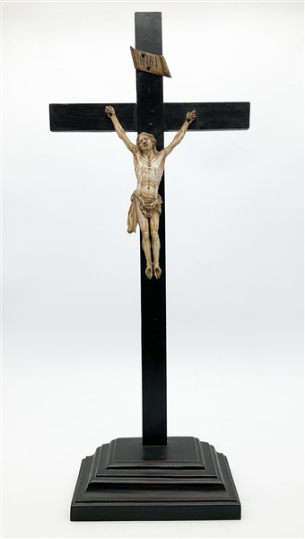 Arte del secolo XIX. Cristo crocifisso in avorio scolpito su croce in legno ebanizzato con base gradinata (cm 62x26) (difetti e mancanze)