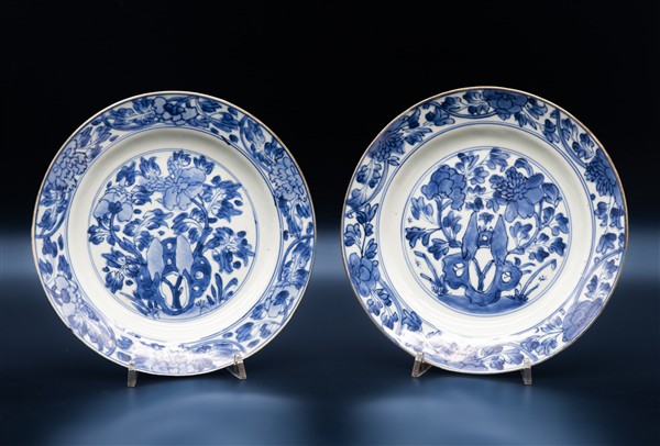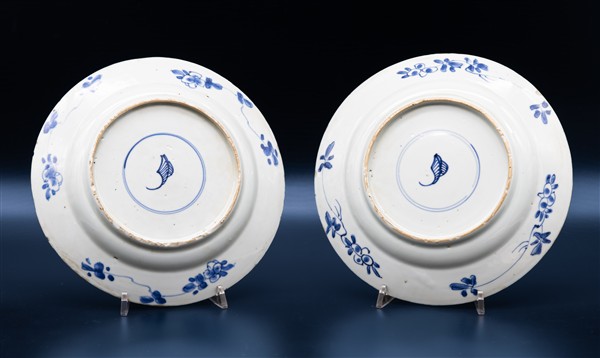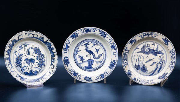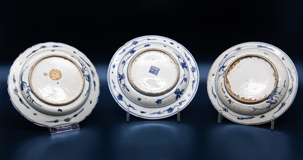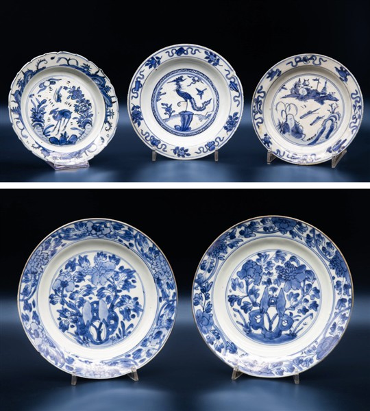 Lotto composto da cinque piccoli piatti a profilo mistilineo in porcellana dipinta in monocromia blu con decori diversi. Cina, dinastia Qing, secolo XVIII (d. max cm 22) (difetti e felature) uno con etichetta di provenienza: Questa antichità, Torino