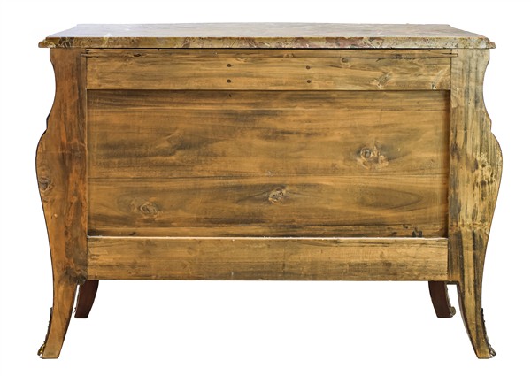 Commode "en tombeau" in stile Luigi XV di forma mossa impiallacciata, filettata e intarsiata a marqueterie in legni vari, fronte a tre cassetti con fregi e guarnizioni in metallo, piano in breccia sagomato (cm 124x92x50) (difetti)