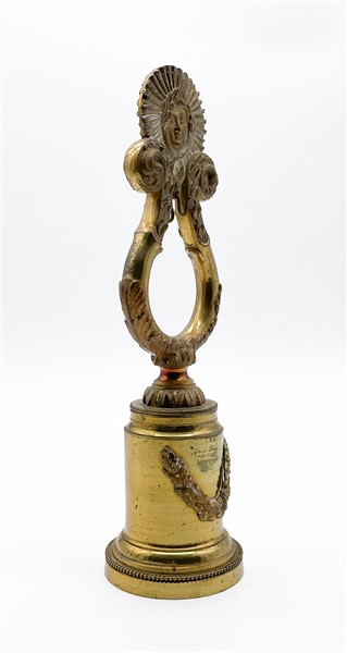 Porta orologio da tasca in bronzo dorato sagomato a lira con cimasa in forma di volto coronato raggiante, base a campana festonata e profilo perlinato (h cm 28,5) (difetti e mancanze)