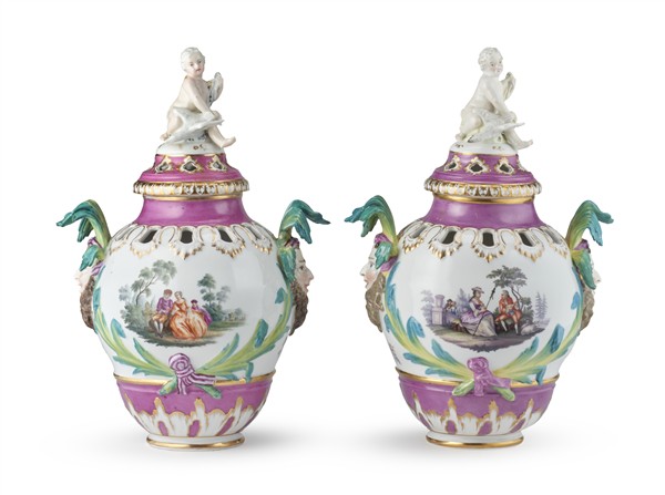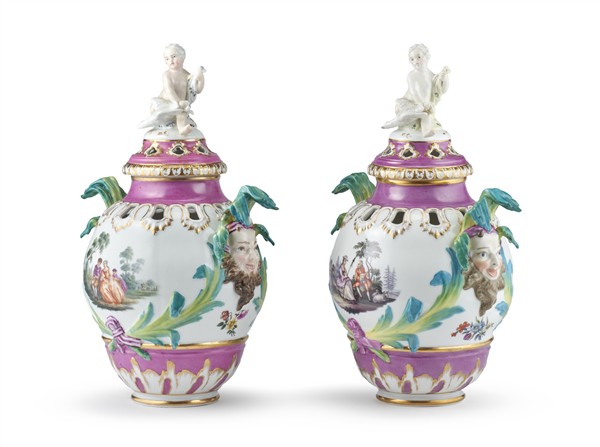 Manifattura KPM, Berlino. Coppia di vasi brucia profumo con coperchio in porcellana traforata e dipinta in policromia a scene galanti e volute in rilievo a foglie e mascheroni barbuti alle anse, profili in oro. Presa del coperchio in forma di putto con volatile e drappo a tutto tondo. Marcati sotto la base (h cm 35) (difetti e restauri)