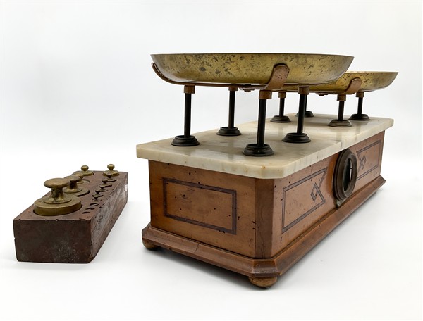 Bilancia con piano marmo e doppio piatto in ottone, corredata dai pesi. Secolo