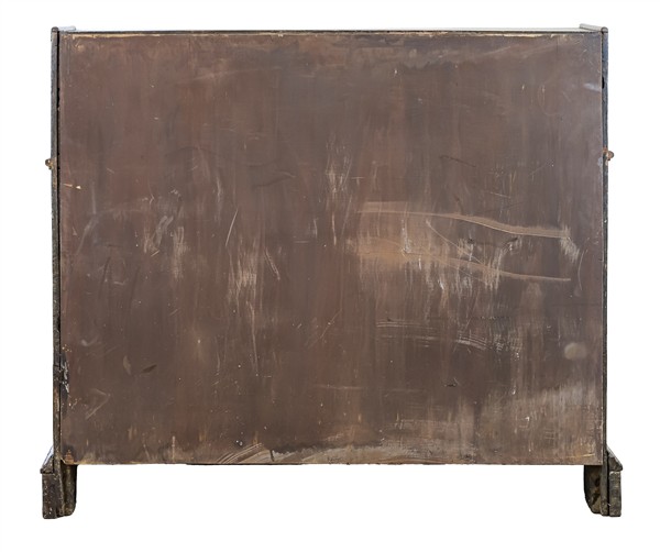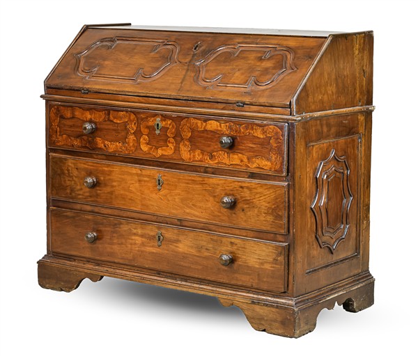 Lotto 467 | Ribalta in noce con fronte a tre cassetti, calatoia che rivela nove tiretti ed
