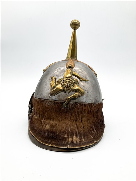 Riproduzione di elmo chiodato "Pickelhaube" con trinacria in ottone dorato a ri