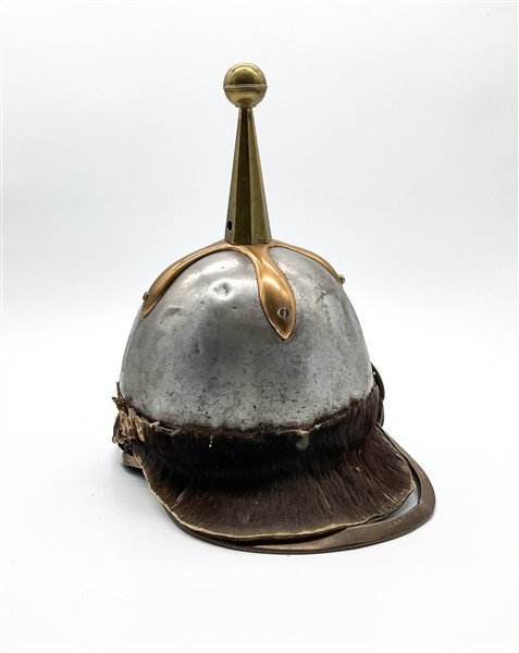 Riproduzione di elmo chiodato "Pickelhaube" con trinacria in ottone dorato a rilievo (cm 20x31) (difetti e restauri)