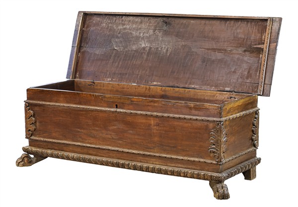 Cassapanca con fronte e fianchi decorati da cornici a foglie, base con bordura baccellata e piedi ferini, piano con profilo unghiato. Secolo XVIII (cm 174x59x55) (difetti e restauri)