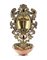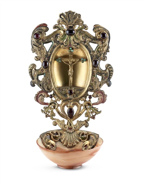 A gilded, engraved, perforated and embossed copper holy water stoup decorated with foliated scroll centered by the Crucified Christ, inserts in garnet and turquoise cabochon, striated agate basin. Rome, 19th century (cm 20x12) (defects and hairline crack in the agate).