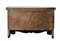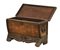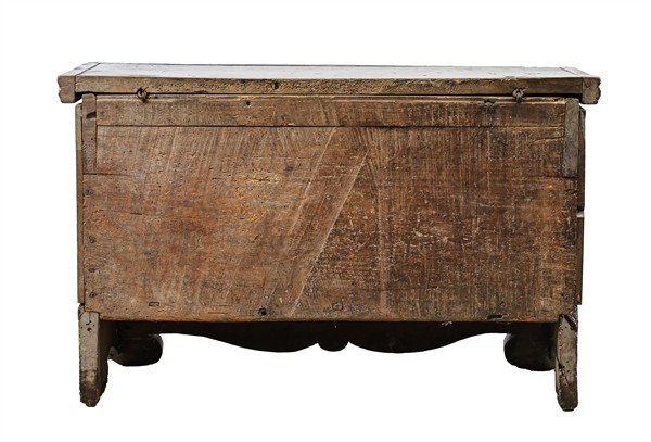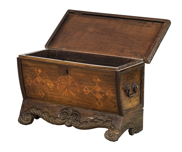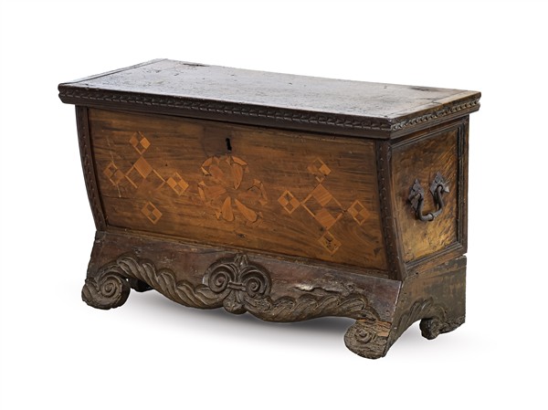 Piccola cassapanca in noce con fronte decorato da intarsi geometrici e base intagliata a volute, maniglie in ferro laterali. Secolo XVII (cm 83x51x38) (difetti e restauri)