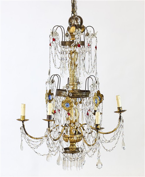 Lampadario a sei luci in stile genovese con fusto in legno intagliato e dorato, bracci e fasce in metallo e lamierino, pendagli in vetro (d cm 68, h cm 115 circa) (difetti e piccole mancanze)