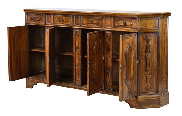 Credenza scantonata in noce e legni vari con quattro sportelli e quattro casset