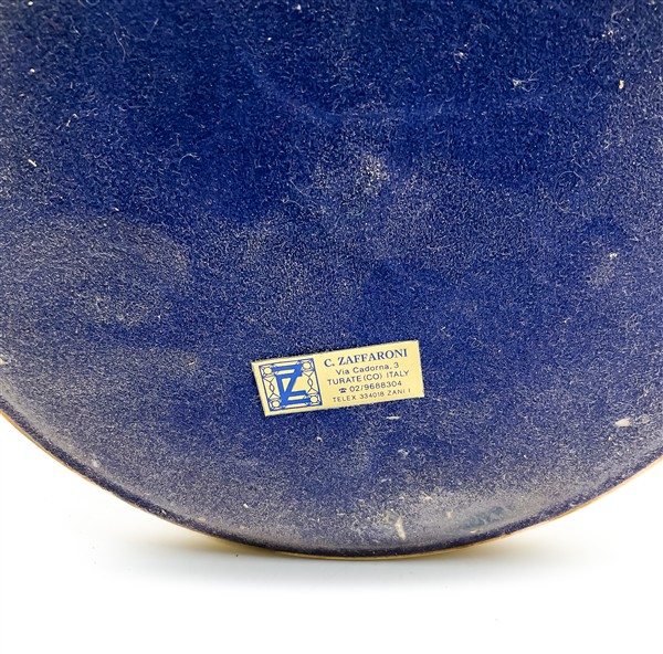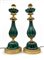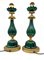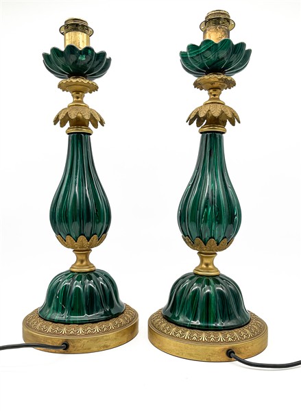Coppia di basi per lampada da tavolo con fusto e bobeche costolati in ceramica dipinta ad effetto malachite, base e raccordi in bronzo dorato con decori a motivi fogliacei. Manifattura Carlo Zaffaroni, Turate (CO), etichette sotto la base (h cm 55) (lievi difetti)