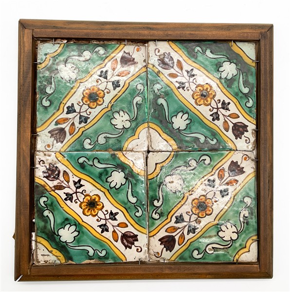Manifattura catalana, secolo XVIII. Gruppo di quattro piastrelle in maiolica policroma con decoro floreale stilizzato. In cornice (cm tot. 31x31) (difetti)