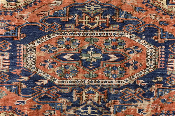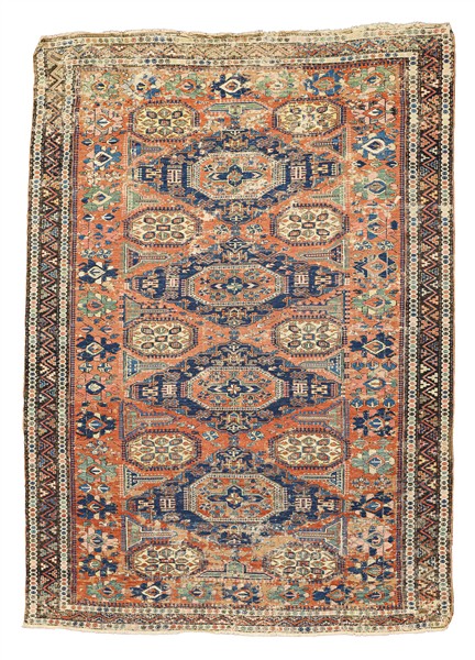 Tappeto Sumak, Caucaso, fine secolo XIX. Decoro con quattro medaglioni romboidali a fondo blu su campo rosa carico. Bordura principale a meandro su fondo marrone scuro (cm 210x157) (gravi difetti e rapature)