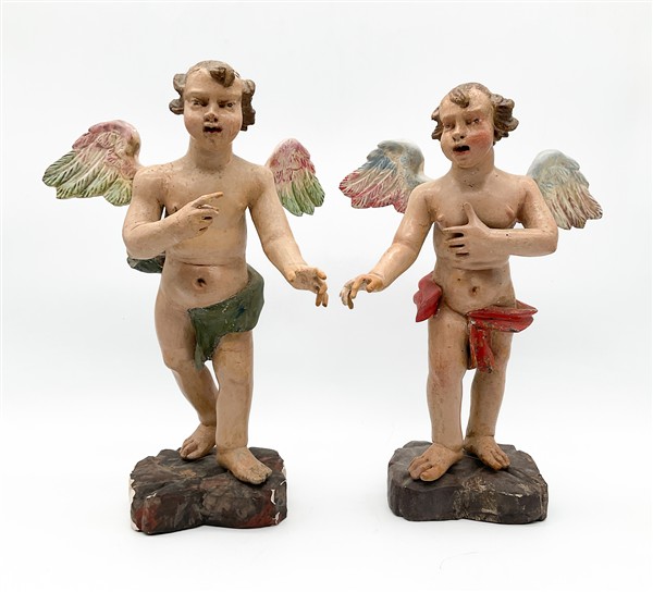Coppia di angeli in legno intagliato e dipinto in policromia su base a zolla. Genova (?), secolo XIX (h max cm 35) (difetti e restauri)