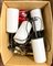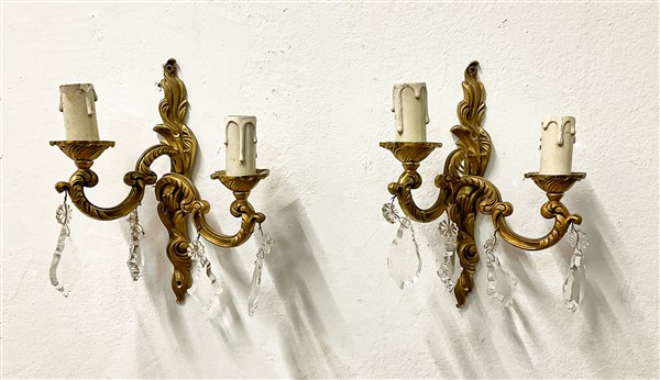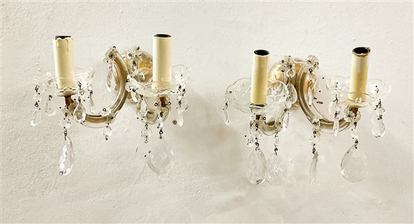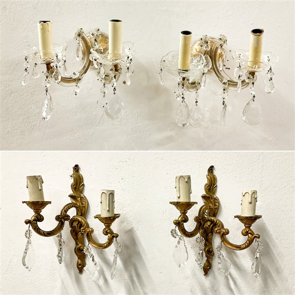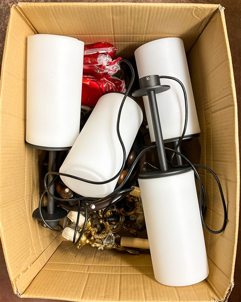 Cartone contenente numerose appliques in metallo e vetro di fatture e misure differenti, un attaccapanni da parete in legno e quattro lampade in plastica (difetti e mancanze)