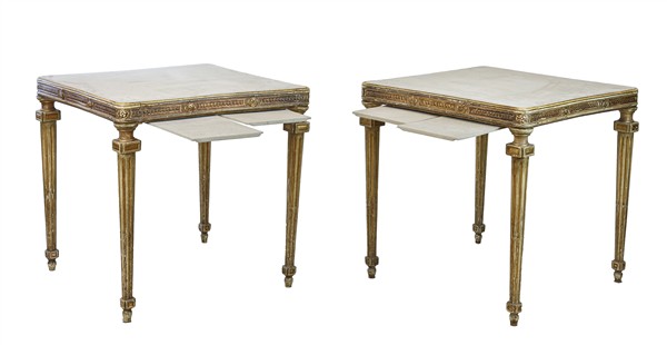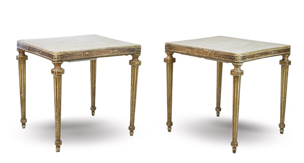 Coppia di tavoli in stile Luigi XVI legno intagliato, laccato e dorato con fascia decorata da meandri e rosette, gambe scanalate ad obelisco rovesciato. Piani rivestiti in alcantara d'epoca successiva (cm 79,5x79x79,5) (difetti)