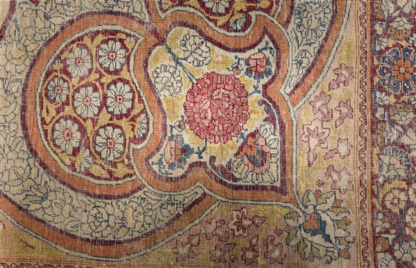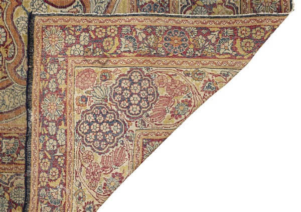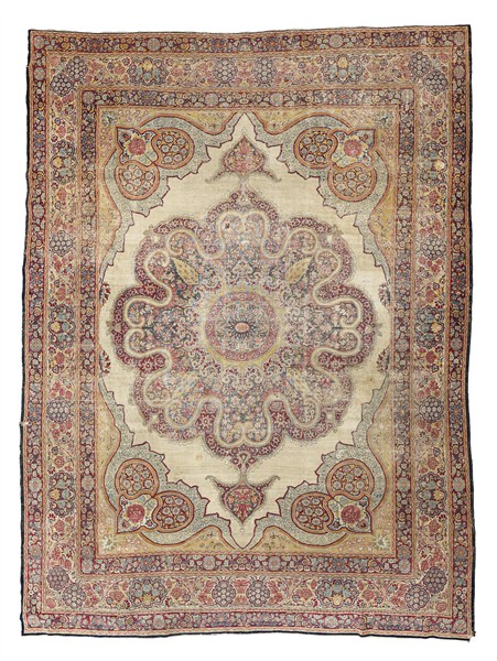 Tappeto Kirman Ravar, Persia, fine secolo XIX. Decoro con grande medaglione imperiale con puntali ornato da un centro tondeggiante su fondo giallo con volute e cipressi contornati da fiori e rose Kadjiar su fondo azzurro. Campo bianco con angolari decorati col motivo angolare dei copricapi degli Scià con al centro una rosa Kadjiar unito da due riserve a fondo giallo con margherite. Bordura principale Herati ornata da rose Kadjiar su fondo bianco (cm 339x261) (difetti, strappi, rapature e vecchi restauri)