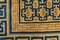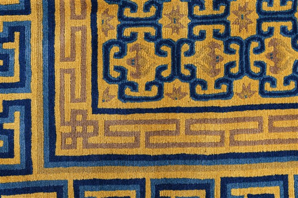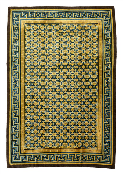 Tappeto Nepal, recente manifattura. Decoro a griglia nei toni dell'azzurro e blu su fondo giallo (cm 320x223) (difetti)
